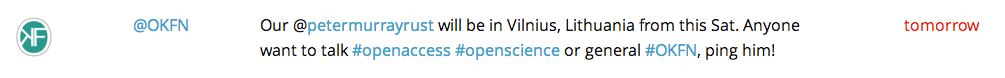 For example, the Open Knowledge Foundation tweeted about @petermurrayrust being in Vilnius this weekend, and HashtagEvent found that tweet and presented it to me in a simple way: