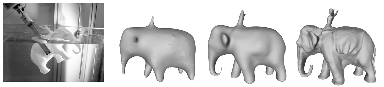 By combining nature’s principles discovered by Archimedes more than 2000 years ago with state of the art modern mathematics of reconstructing shapes using partial information (volume of slices), researchers have invented the so-called “dip transform”, and it is a beauty [1, 2]! Using a robotic arm, they dip an object in water in various orientations up to a thousand times and measure the volume of displaced water each time – with this information they are then able to construct a detailed 3D model. There are many benefits to this approach compared to other methods of acquiring accurate models (it’s non-destructive, manages complex shapes well), but also it’s just plain awesome. Using nature for what nature knows best (it constantly “calculates” the volume of submerged objects as a side-product of upholding physics anyway) to provide data for your own algorithms.