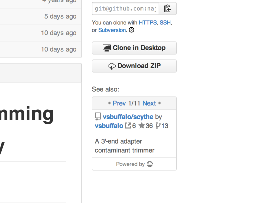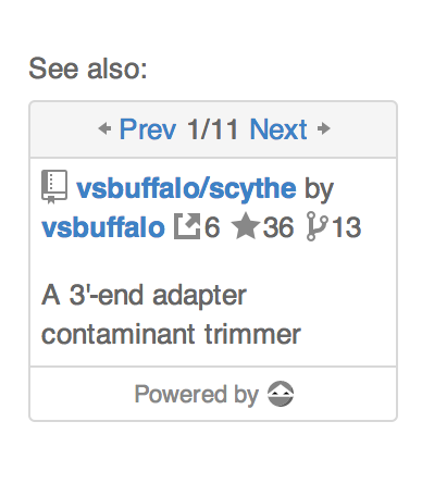 There are eleven recommendations for https://github.com/najoshi/sickle. Eleven pieces of software were cited in papers where sickle was cited and in papers which the paper where sickle was cited cited. Wooh. The external link icon above signifies citations, for example, we found 6 citations for scythe. The rest should be self explanatory. This view is then simply embedded into the standard GitHub interface: