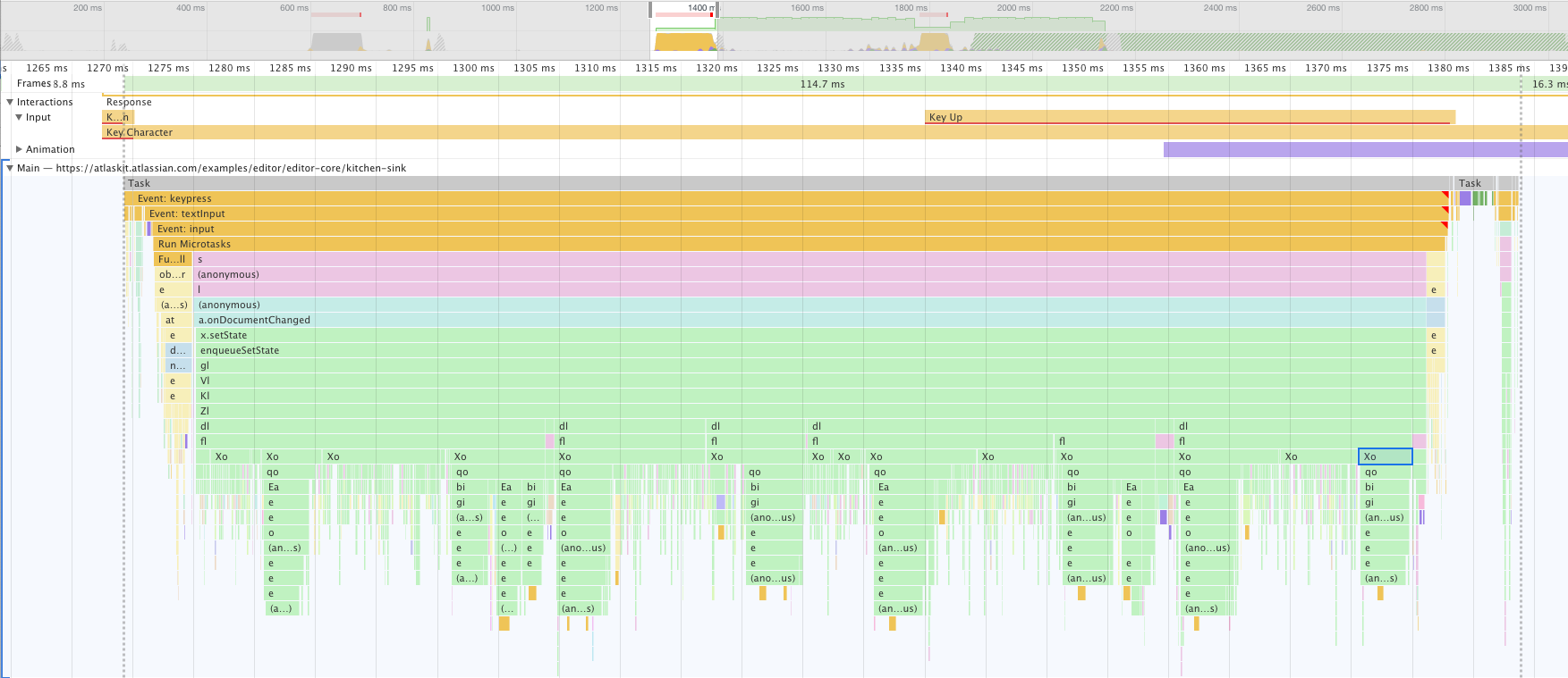 That's a bit more understandable on the surface of it: the call tree's a bit flatter and there are also some patterns emerging with the Xo calls at the bottom there (it's React Fiber's beginWork). In fact, only the narrow light yellowy bit at the beginning is ProseMirror (which powers Atlassian's editor text editing bits), all of the green stuff is React. So it does look like you could take this apart and understand it a bit more easily, compared to Slack's implementation (it being open source also helps!). The downside is that it is slower still, taking a good 7 frames to render that letter. 🤷♂️