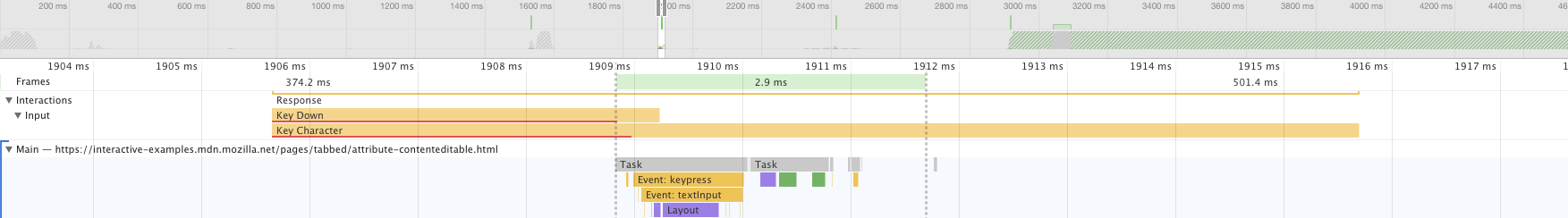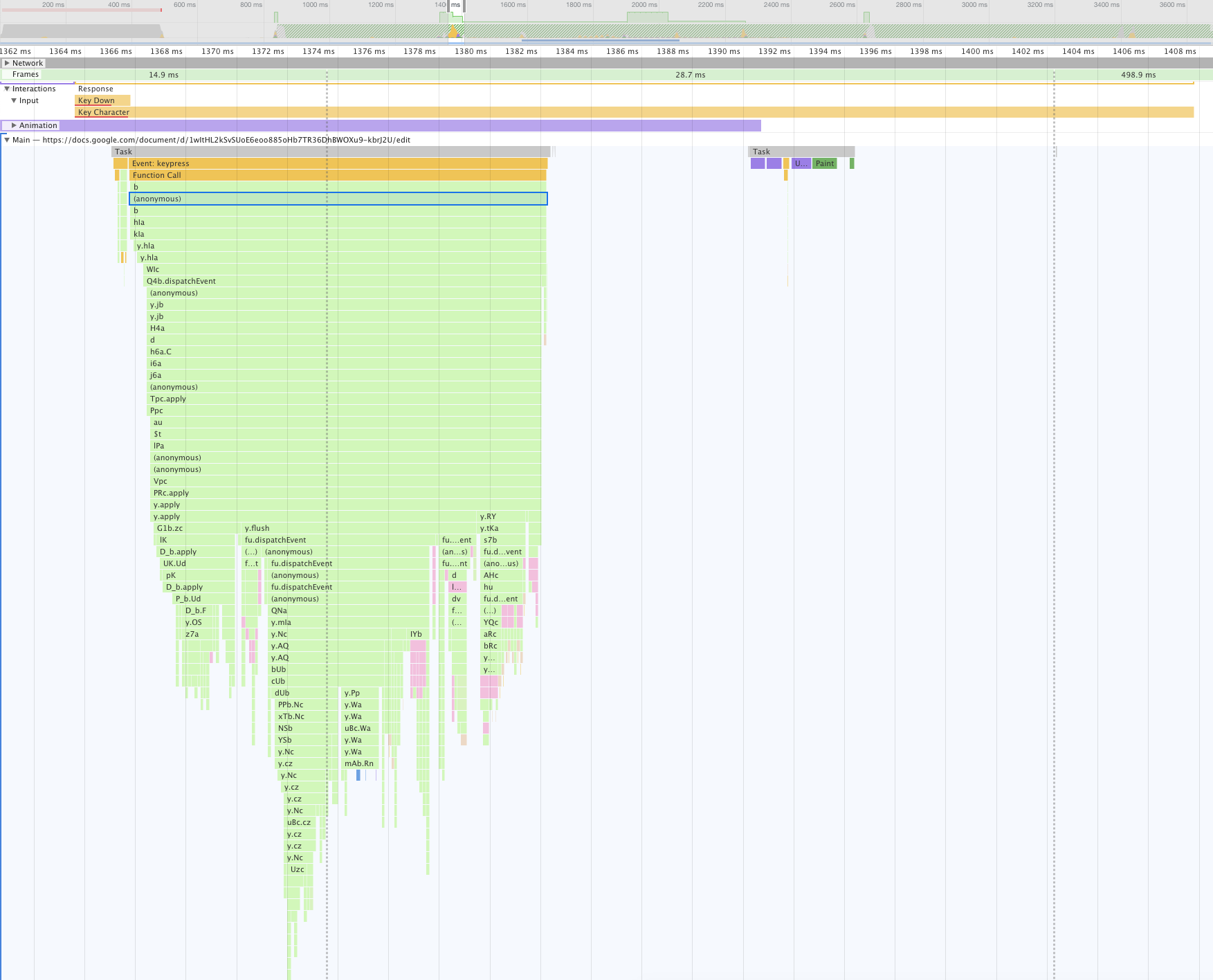 Hmm, ok. There's a lot going on here as well – when examined a bit, it boils down to an edit-applied event being dispatched and several things responding to it. For example, the “stalactite” before last is the one that actually creates a text node and sets its content. A lot of this is layout and styles, setting the spaces, moving the cursor (in Google Docs the cursor is just an absolutely positioned div 😱), things that would be dealt with internally by contenteditable if used. Despite all that, it looks like Google Docs doesn't even skip a frame while processing that keypress - being the only “big” editor listed here to be this fast. Remarkable!