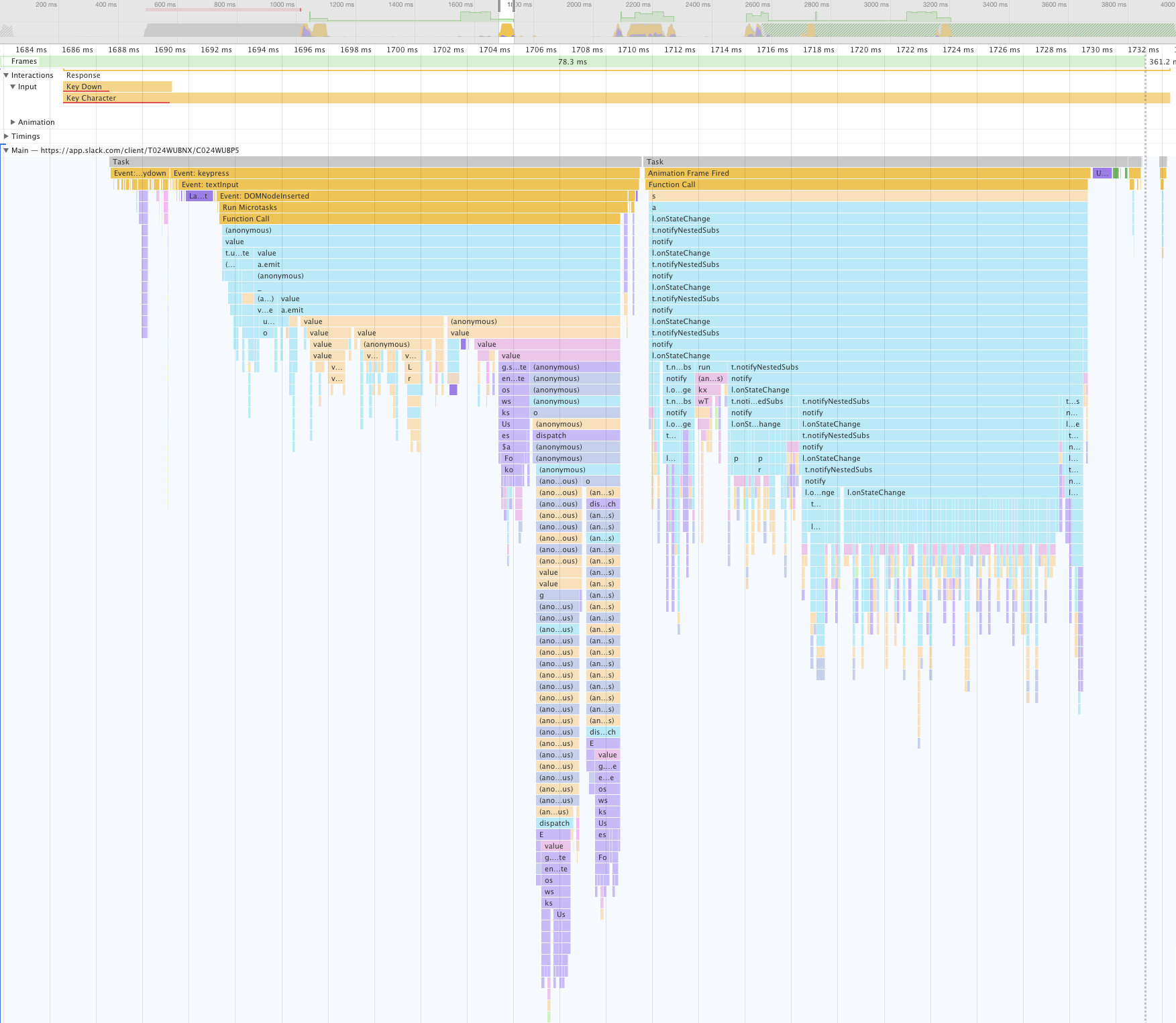 Whoah. That’s a lot of stuff. It takes almost 4 frames to render (if aiming for 60 fps), and the call tree right at the bottom there is around 80 levels deep! Of course Slack has to do all sorts of processing on text entry, from mentions to formatting to commands, but it’s still surprising how hundreds of function calls are needed to get that one letter to render (and we're even ignoring a whole other universe of things that need to happen from the physical keypress to a fired keypress event in the browser)!